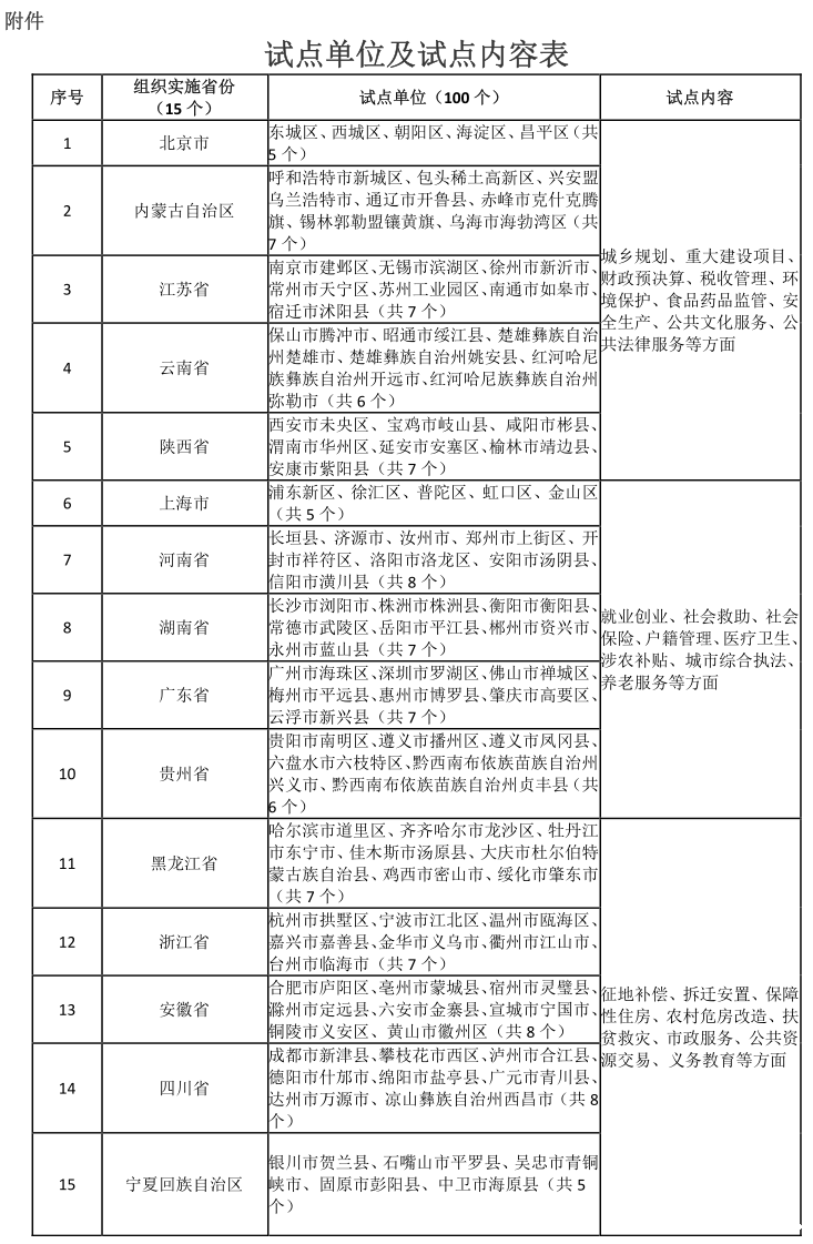 根据各地区实际情况和政务公开工作基础,确定在北京市、安徽省、陕西省等15个省(区、市)的100个县(市、区)(以下称试点单位),重点围绕城乡规划、重大建设项目、公共资源交易、财政预决算、安全生产、税收管理、征地补偿、拆迁安置、保障性住房、农村危房改造、环境保护、公共文化服务、公共法律服务、扶贫救灾、食品药品监管、城市综合执法、就业创业、社会保险、社会救助、养老服务、户籍管理、涉农补贴、义务教育、医疗卫生、市政服务等方面开展试点工作(《试点单位及试点内容表》附后)。承担试点任务的省(区、市)在做好试点工作的同时,可以结合实际适当增加试点内容。