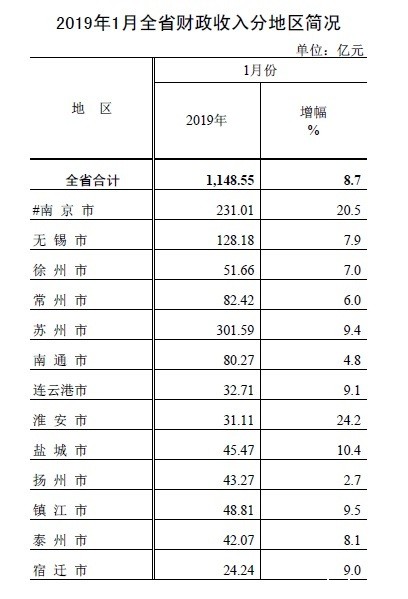 1月份,全省一般公共预算收入完成1148.55亿元,增长8.7%。其中,税收收入完成1010.20亿元,增长5.6%;非税收入完成138.35亿元,增长37.7%。全省税收占比为88.0%。