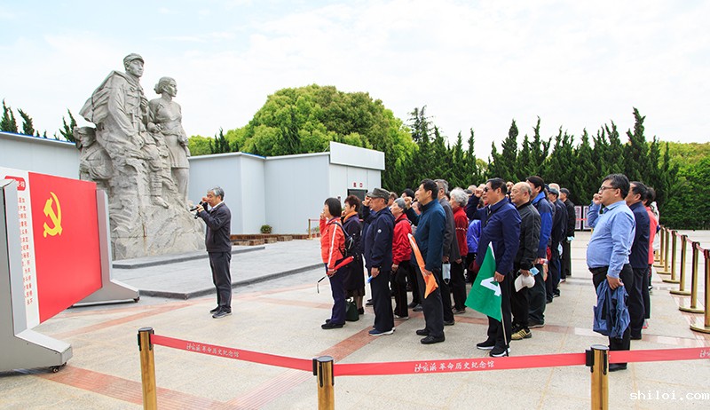 在沙家浜红色教育基地,老同志寻觅抗日战争时期发生在芦苇荡的故事,在庄严的雕塑前,全体党员向英雄塑像三鞠躬,深切缅怀为民族解放、国家富强和人民幸福英勇献身的革命烈士,并重温入党誓词。