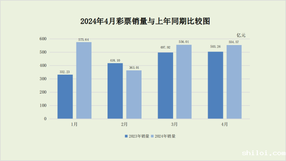 1-4月累计,全国共销售彩票2049.23亿元,同比增加297.73亿元,增长17.0%。其中,福利彩票机构销售699.62亿元,同比增加145.68亿元,增长26.3%;体育彩票机构销售1349.61亿元,同比增加152.05亿元,增长12.7%。